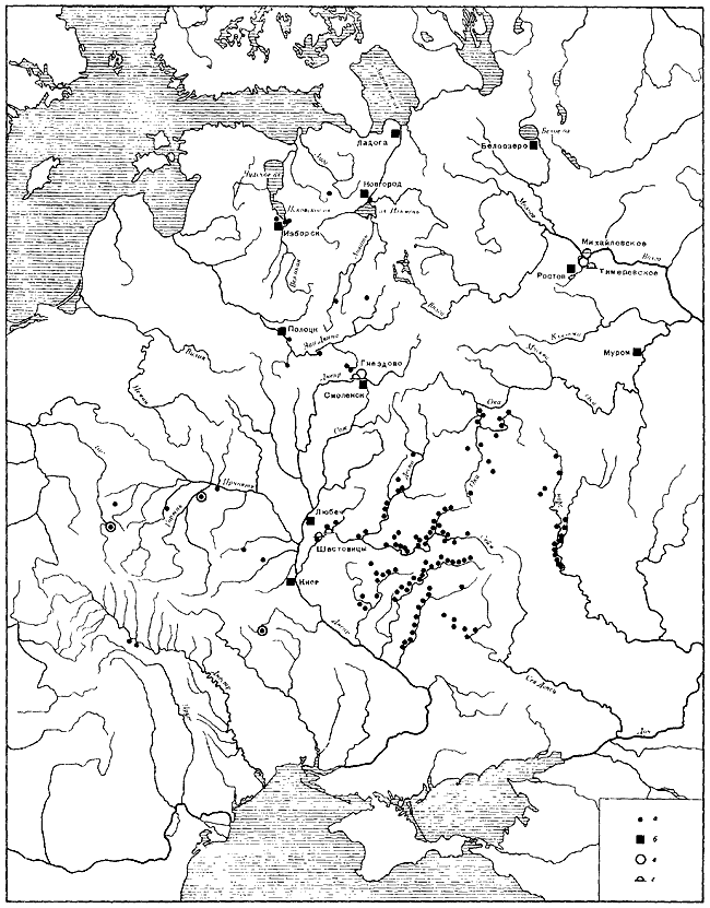 Такими же, насколько можно представить по фрагментарным материалам, были условия возникновения Ростова, Белоозера и Мурома. Они выросли из племенных центров мери, веси и муромы, располагавшихся в регионах сосредоточения населения.