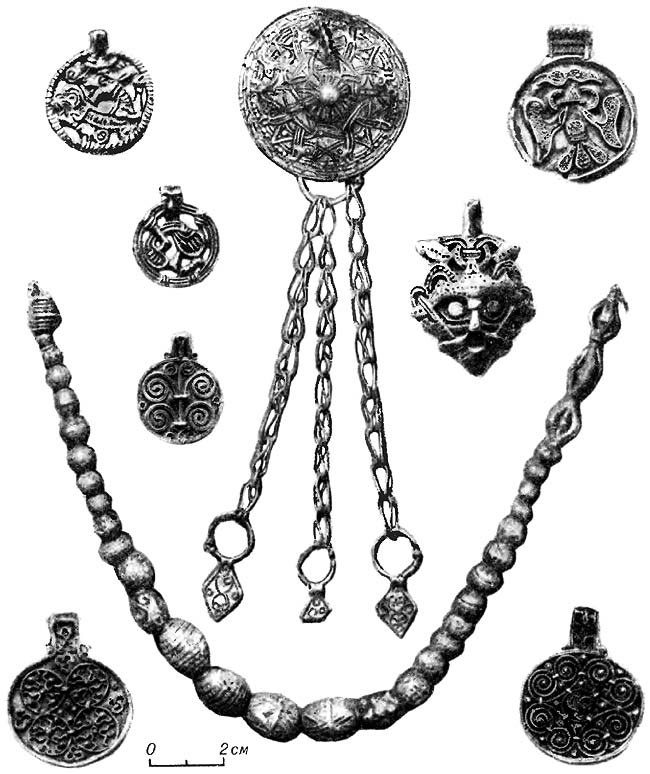 Значительный интерес представляют разнообразные украшения. Среди височных украшений имеются проволочное кольцо средних размеров с завязанными концами и с надетыми бусинами (табл. LXVIII, 3) и небольшое проволочное кольцо с концом, завернутым в спираль (табл. LXX, 21). Довольно многочисленны бусы: стеклянные – преимущественно синего цвета, но известны и иной окраски; пастовые с различными узорами; сердоликовые призматические и многогранные (табл. LXX, 22, 23), а также металлические. Среди них известны сканые высокохудожественные (табл. LXVIII, 5, 12) и плетеные из серебряной канители (табл. LXX, 15, 16). Нагрудные украшения представлены лунницами и разнообразными привесками, в том числе со сканым узором. Серебряные художественные изделия, украшенные зернью, встречены неоднократно, а золотые очень редки. Интересна золотая бляха с изображением свернувшегося дракона.