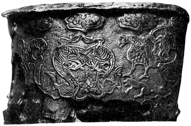 Турьи рога-ритоны из Черной Могилы окованы серебром вокруг устья и украшены квадратными накладками в средней части (рис. 16, 17). Оковка меньшего из рогов (длина 54 см) орнаментирована растительным узором, переплетенным в гирлянды (табл. LXXII, 4). Другой турий рог (длина 67 см) украшен сложнее – на оковке вычеканен интереснейший фриз из разнообразных чудовищ, птиц и людей (табл. LXXII, 1–3).