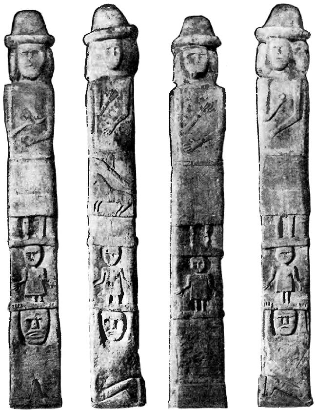 Длинный опоясанный кафтан показан на мужских фигурах Збручского идола, описание и изображение которого приведены ниже (рис. 19; табл. LXXVI).