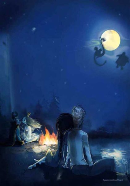 Стоял поздний вечер, они сидели все вместе на берегу реки и смотрели на звёзды. На фоне луны изредка мелькали силуэты летучих мышей, Дракона и Избушки.