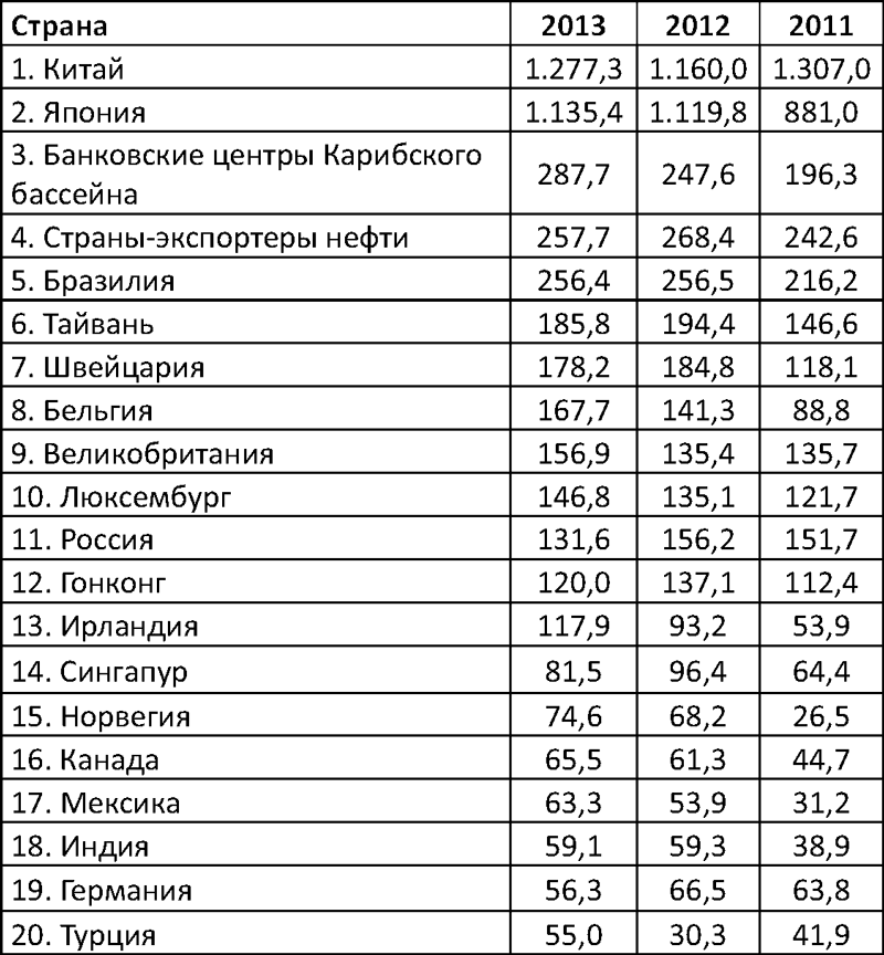 4. Лишь две страны из всего приведенного списка за период 2011–2013 гг. уменьшили свои инвестиции в бумаги казначейства США – Германия и Россия (соответственно на 11,8 и 13,2 %). Если в середине позапрошлого года Россия находилась на 6 месте среди иностранных держателей казначейских бумаг США, то в середине прошлого – на 8 месте, а в середине этого года оказалась на 11 месте.