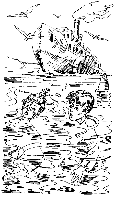 Новая волна тащит Динку вниз и накрывает с головой. Чья-то рука больно вцепляется в волосы, и сильным рывком поднимает захлебнувшуюся девочку над водой… На один короткий миг Динка видит бледное мокрое лицо мальчика с баржи Она хочет ударить его, вырваться, закричать, но вода залепила ей рот и нос, ей нечем дышать… Лицо мальчика то исчезает, то снова появляется рядом. Синие губы его шевелятся: