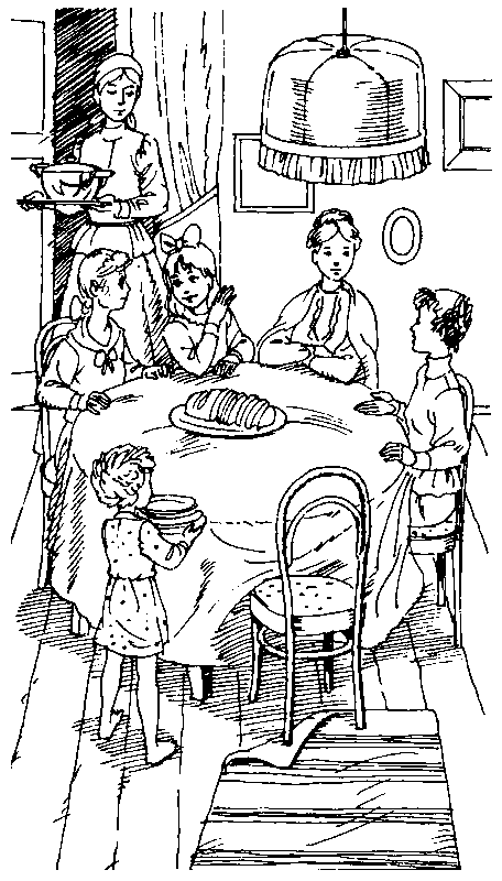 Младшие дети сейчас же сбегаются на ее голос и нетерпеливо топчутся около стола. Но Алина не любит, чтоб они смотрели на часы, она смотрит сама и спустя некоторое время еще громче и еще торжественней сообщает: