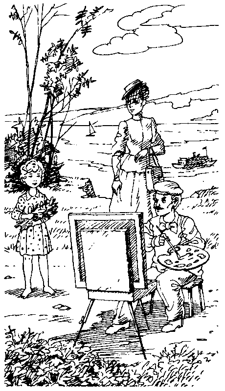 А на берегу появляются уже дачники. Динка видит двух человек – женщину и мужчину. Мужчина в белом халате, как доктор. Он что-то рисует, глядя на обрыв. Рисует он на большом полотне, натянутом на рамку. И рамка эта с полотном стоит перед ним на трех деревянных ножках. «Художник! – догадывается Динка. Интересно посмотреть, что он рисует». Женщина укалывает ему на Волгу и что-то говорит. На ней белое платье и кружевная накидка. Когда она оборачивается к обрыву, видно ее нежно-розовое лицо, окаймленное черными локонами.