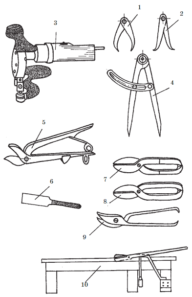 Рис. 7. Инструменты для кровельных работ по металлу: 1 – кронциркуль; 2 – нутромер; 3 – электровиброножницы; 4 – циркуль для разметки; 5 – ножницы для резки листов и асбестоцементных плит; 6 – шпатель; 7 – правые ножницы; 8 – левые ножницы; 9 – ножницы с изогнутыми ножами; 10 – стуловые ножницы
