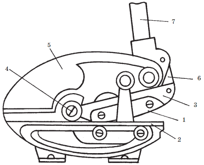 Рис. 8. Стационарные ножницы с ручным приводом: 1 – подвижной нож; 2 – неподвижный нож; 3 – опора; 4 – ось; 5 – корпусная станина; 6 – передаточный рычаг; 7 – рукоятка