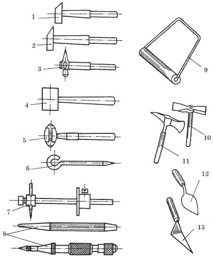 Рис. 9. Инструменты для кровельных работ: 1 – молоток-подсекальник; 2 – молоток-ручник; 3 – слесарный молоток; 4 – киянка; 5 – молоток-правильник со сменным бойками; 6 – чертилка; 7 – рейсмус; 8 – кернеры; 9 – каток; 10 – молоток-кирочка; 11 – молоток-топорик; 12 – кельма овальная; 13 – кельма остроугольная