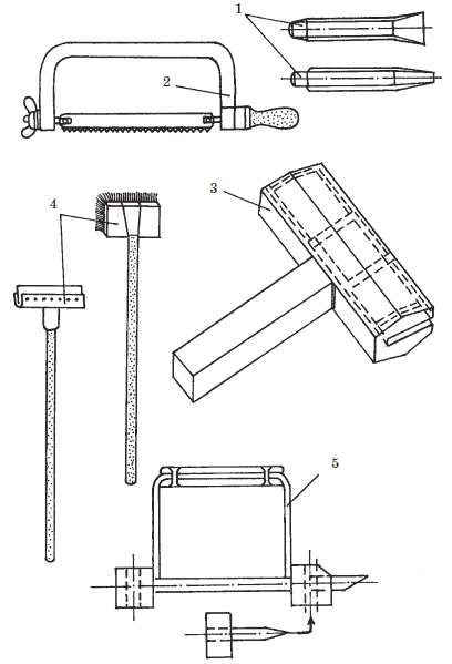 Рис. 9. Инструменты для кровельных работ (продолжение): 1 – зубила; 2 – ножовка; 3 – кромкогибщик; 4 – щетки для на несения горячей мастики; 5 – гребнегиб для формирования фальцев