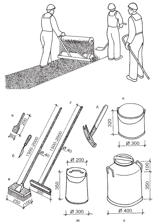 Рис. 11. Ручной инструмент для кровельных и изоляционных работ: а – шпатель металлический; б – шило шорное; в – щетка для нанесения мастики; г – гребок с резиновой вставкой; д – молоток штукатурный; е – бачок для мастики емкостью 20 л; ж – ведро вместимостью 15 л; з – термос емкостью 25 л