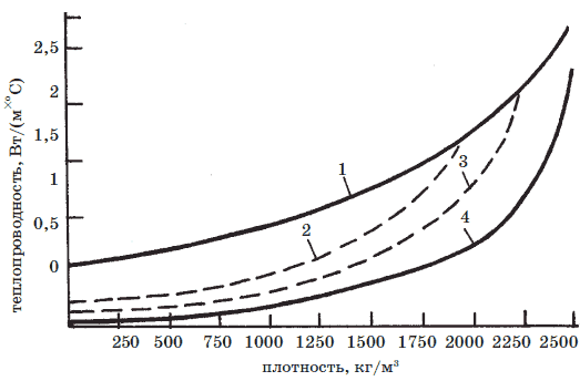 Рис. 12. Зависимость теплопроводности неорганических веществ от плотности: 1 – материалы, насыщенные водой; 2, 3 – воздушно-сухие материалы с разной влажностью; 4 – сухие материалы