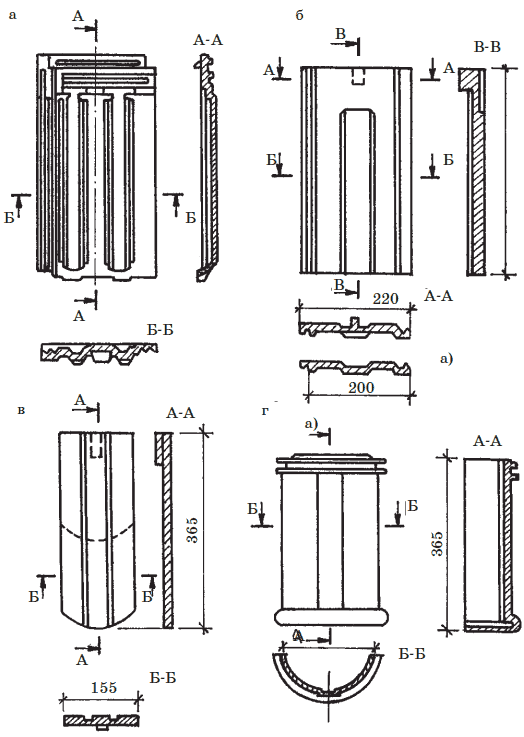 Рис. 14. Черепица глиняная: а – пазовая штампованная; б – пазовая ленточная; в – плоская ленточная; г – коньковая
