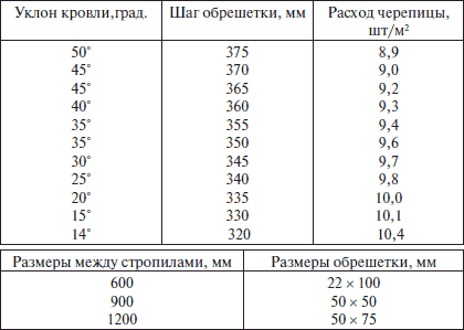 Таблица 7. Ориентировочный расход цементно-песчаной черепицы БРААС и шаг обрешетки в зависимости от уклона кровли