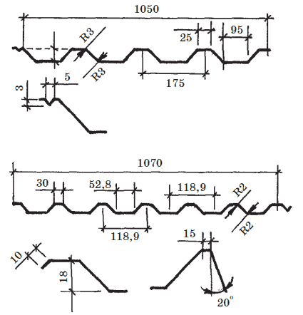Асбестоцементные волнистые листы усиленного профиля ВУ-К имеют длину 2300–2800 мм, ширину 994, толщину 8, высоту волны 50, шаг волны 167 мм. Масса листа 36–44 кг ( рис. 18).