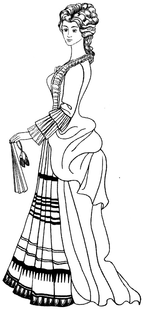 Основа дамского гардероба – платье – состояло их двух частей: лифа и юбки, которая не имела жесткой основы, но была весьма пышной за счет своих накрахмаленных составляющих: нижней юбки, называемой фрипон, и верхней – модест.