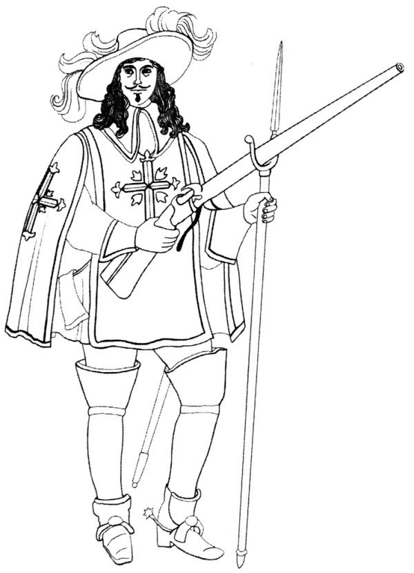 Конные королевские мушкетеры носили красные мундиры, на которые были наброшены темно-голубые короткие плащи типа «казак» с большими крестами из серебряных нитей, обрамленные лучами алого или желтого пламени – в зависимости от принадлежности к тому или иному подразделению мушкетерской гвардии.