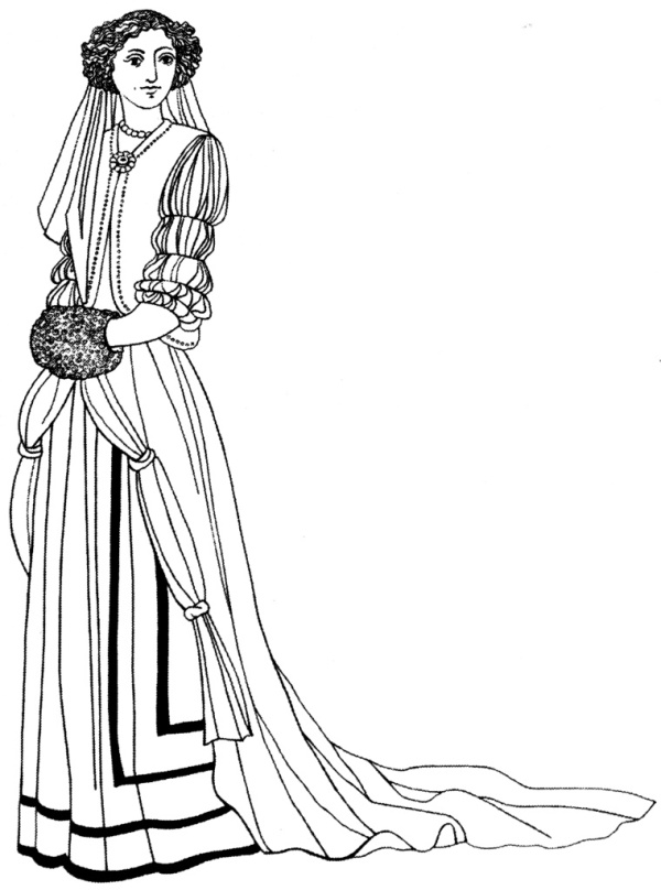 Верхней одеждой знатной дамы служили: широкий распашной роб с высокой линией талии и несколькими застежками вверху, и кап – пелерина из черного шелка, с капюшоном.