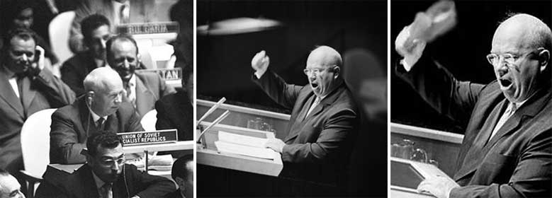 Сотрудница ООН указывает на то, что Хрущёв по пюпитру все же стучал. Правда, свидетельница оговаривается: «Он в запальчивости стал колотить по столу предметом, который случайно оказался у него в руках. Если бы он тогда держал зонтик или трость, то принялся бы стучать зонтиком или тростью. Это произошло во время выступления представителя Филиппин. В своем выступлении посол страны, с XVI по середину XX века испытывавшей на себе тяготы сперва испанского, а затем американского колониального владычества, напомнил, что и СССР должен дать свободу находящимся под его властью народам. Более того, филиппинец сравнил Союз с концлагерем и напомнил о венгерском восстании, четырьмя годами ранее утопленном в крови советской армией. Слушая синхронный перевод, сидевший на своем месте в зале заседаний, Хрущев постепенно приходил в ярость. Глава советской делегации начал махать руками, требуя слова, но председатель Генассамблеи эти сигналы игнорировал. Тут и произошел случай с ботинком». Мда-а-а а фотомонтажом уже тогда занимались, и появилось фото Хрущёва с ботинком в руках на трибуне ООН. Что это монтаж легко доказать, посмотрев ту фальшивку и оригинал снимка. Притом ботинок на столе со шнурками, а в руке без.