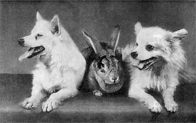 Собаки Отважная, Малёк и крольчиха Звёздочка.