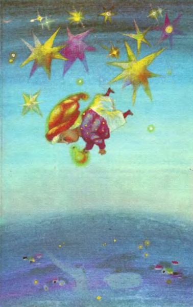 Але довкола стояла глуха тиша, тільки чутно було, як подзвонюють навколо скляні, блискучі зорі. Бігунцеві аж холод у п'ятки зайшов, коли він ще раз зирнув на землю, а вуста його тихо зашепотіли ще одну казку про те, що не треба нічого боятися. Він заплющився, притулив до грудей золоту гарбузку, відштовхнувся і полетів униз. А ті, котрі дивилися з землі у небо, вигукнули здивовано: