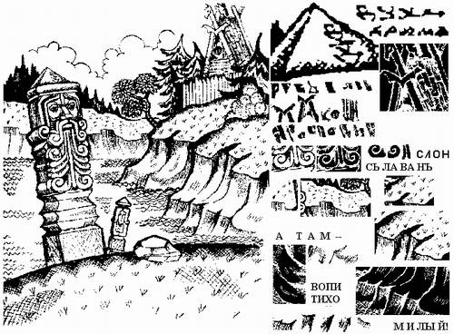 На этом рисунке художница решила вписать тайные надписи, как это практиковалось у славян. На крыше избушки можно прочитать наверху слова РУСЬ И, на верху крыши в виде листов – ЯВЬ, на фронтоне – МАКОШИ, внизу на крыше – ЯРОСЛАВНЫ. На крыше идола читается ДУХИ ХРАМА, внизу в виде узора руницей – СЛАВАНЪ(эту часть Антипова не придумывала, поскольку руницей она не владеет, а срисовала с многочисленных славянских орнаментов). В виде верхушки оврага начертано А ТАМ, а сбоку обрыва справа – слова ВОПИ ТИХО, МИЛЫЙ! (Для чтения их надо обратить в цвете, а две первых буквы – еще и повернуть направо на 900). Кроме того, сверху на правой ели можно видеть слово МИЛАЯ, а под ним, в цветнике – слово РУССКАЯ, которые я не отметил в виде особых чтений. Так что здесь начертано МИЛАЯ РУСЬ И РУСКАЯ ЯВЬ МАКОШИ ЯРОСЛАВНЫ. ДУХИ ХРАМА СЛАВЯН. А ТАМ – ВОПИ ТИХО, МИЛЫЙ ! Итого – 13 слов, вписанных в рисунок по всем правилам русских изображений. Это делает честь художнице и авторам Словаря.