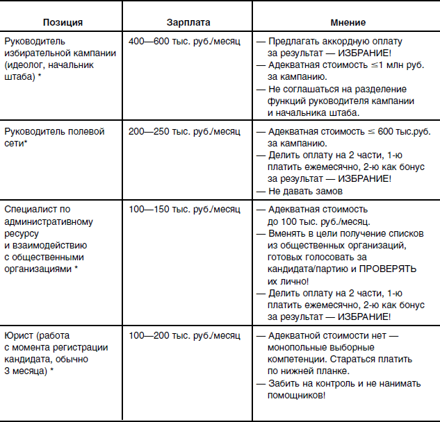 * Зарплаты приведены из расчета периода избирательной кампании 6 месяцев. При сокращении периода работы штаба ежемесячные оплаты увеличиваются. Ориентиром оплаты служит сумма за кампанию.