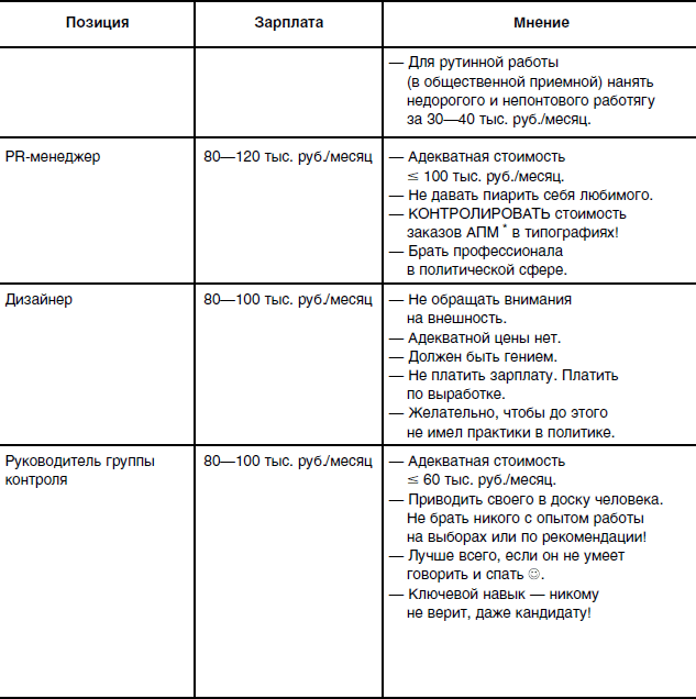Поэтому примерно за пару недель мне предстояло набрать следующих сотрудников: руководителя кампании, руководителя полевой сети, руководителя группы контроля, PR-менеджера, дизайнера, бухгалтера, юриста, секретаря и сотрудников общественной приемной кандидата.