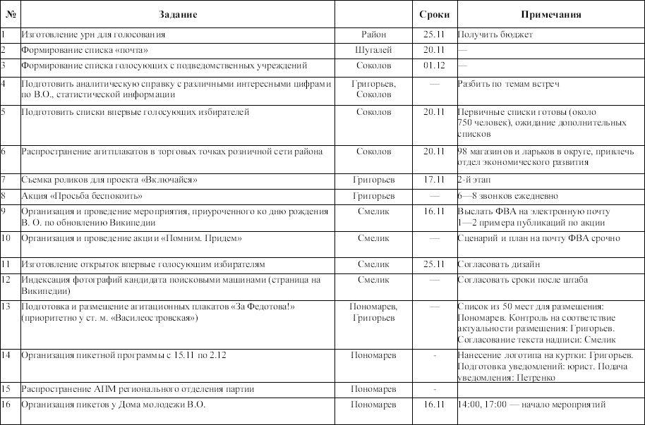 Мне даже пришлось ввести протоколы заседаний штаба, чтобы принятые идеи и договоренности не забывались уже на следующий день. Вообще, с энтузиазмом публично поддержать идею и развить ее, а на следующий день даже не вспомнить – общепринятый стиль всех, кто работает на выборах. Я до сих пор жду, когда появится моя страничка в Википедии, индексированные фотографии с мероприятий в Интернете, должностные инструкции ряда сотрудников штаба, график присутствия начальника штаба в штабе, ежемесячные медиапланы, сценарии мероприятий, еженедельные отчеты по обработке обращений в приемную в соответствии с утвержденными шаблонами, тренинг по умению давать интервью на камеру и т. д. Что-то из этого как-то делалось или организовывалось, но большинство не было сделано вовсе.