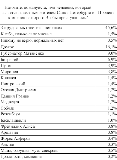 Еще исследование продемонстрировало, что район не знает (и не признает) назначенных авторитетов. Портфель и кресло, умноженные на служебную машину, воспринимаются как функция, которой положено отвешивать порцию «ку». Но цитировать мнение таких авторитетов, и тем более прислушиваться к нему дураков нет. То есть еще раз: в одном из старейших районов Питера, где каждый второй житель – заслуженный лидер общественного мнения, не было ни одного «народного паровоза», готового вписаться за «ЕР» или хотя бы не демонстрировать свою враждебность. Действующая районная власть, действующие муниципальные власти трех муниципальных образований, лояльные им ЛОМы [4] , судя по исследованию, реальным авторитетом не обладали. Эти выводы сэкономили деньги, отложенные «на сотрудничество», и не дали пойти по ложному пути.