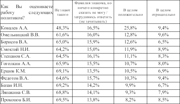 Первое исследование оказалось показательным. Показательным был уровень брака – после отсева остались результаты опроса полутора тысяч респондентов. По состоянию на середину сентября 2011 года, рейтинг «ЕР» в округе составлял 45 %, личный рейтинг кандидата в депутаты ЗакСа Санкт-Петербурга Федотова Валерия – 0 % (выдержки из той социологии можно посмотреть в конце главы). И показательна была моя реакция – мне понравилось. Результаты этой социологии вызывали доверие. Я знал, что на улице у меня не попросят автограф, – руководитель исполкома партии в районе имеет образ кого угодно: статиста, бюрократа в нарукавниках, человека-телефона, только не узнаваемого политика. Я правда был вполне доволен – четверть миллиона были потрачены эффективно.