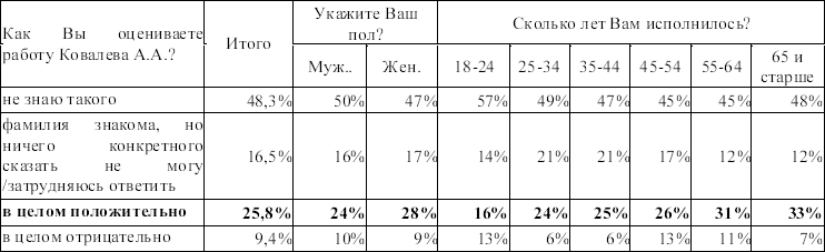 Чем старше группа респондентов, тем чаще они дают положительные оценки деятельности депутата. Среди избирателей старше 55 лет рейтинг положительной оценки деятельности Ковалева достигает 31–33 % (см. таблицу).