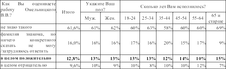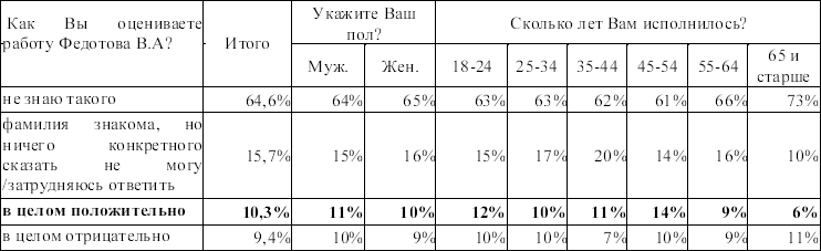 Есть неярко выраженная возрастная тенденция в оценке деятельности Федотова. Чем старше группа респондентов, тем ниже рейтинг известности Федотова. Так, среди избирателей старше 65 лет 73 % опрошенных не знают этого политика.