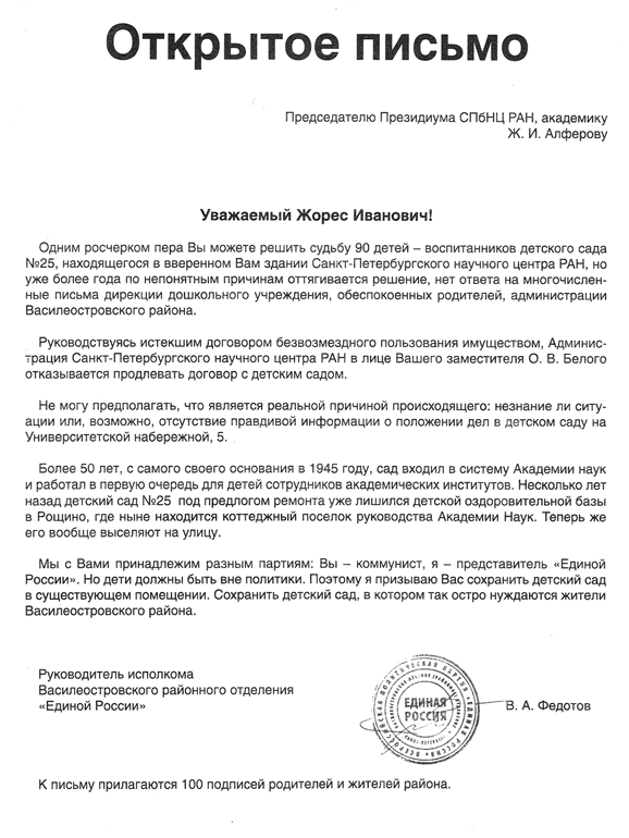 Однако даже из этих суровых правил «молчание равно карьера» оказались исключения: иногда проблемная повестка нужна, чтобы прощупать меру и степень предстоящей беды. Вот так и меня решили использовать в качестве наживки на больной теме нехватки муниципальных детских садов в городе. Вернее, я оказался в нужное время в нужном месте. Так я стал героем спасения детского сада № 25, расположенного по адресу Университетская набережная, дом 5, существующего по этому адресу с 1945 года и выселяемого арендодателем. Помещение сдает в аренду Российская академия наук, возглавляемая, по счастливому совпадению, заслуженным нобелевским лауреатом Жоресом Алферовым. Я на самом деле получил бинго, потому что это был не только большой политик, но и депутат КПРФ в Госдуме, которого можно было критиковать в период выборов по определению – как политического конкурента. Оставалось решить главную проблему – публично втянуть Алферова в эту историю и прочно связать его имя с решением о выселении. Операция «спасение» казалась предельно простой: государственное предприятие, возглавляемое коммунистом Алферовым, то есть получающее деньги из бюджета РФ, пытается выселить государственное дошкольное учреждение с 85 детьми на улицу! Была организована информационная волна в городских СМИ, стартом которой явилось открытое письмо, опубликованное в газете «Коммерсант». Вот оно (см. с. 72).