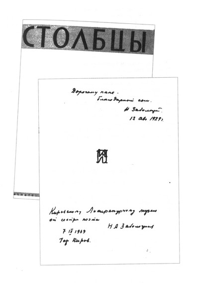 Сохранилась шутливая надпись Заболоцкого на экземпляре «Столбцов», подаренном Николаю Олейникову: