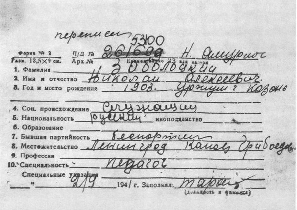 Карточка формы № 2 заключённого Н. А. Заболоцкого