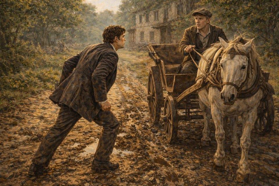Он снова не отреагировал. Лошадь продолжала тянуть, повозка медленно, но упрямо катилась вперёд, и в этот момент я понял, что словами его не остановлю. Я обежал повозку и остановился прямо перед ней, так близко, что грязь с обода брызнула мне на сапог. Это был риск, но другого выхода не оставалось.