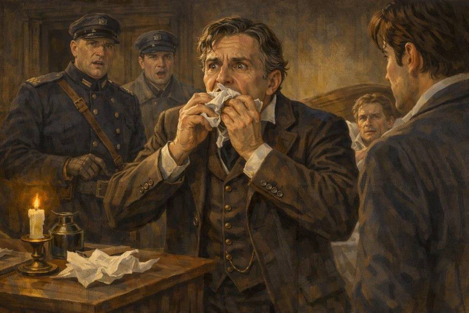 Городничий, выпучив глаза, смотрел на доктора. Тому тоже отступать было некуда, и он продолжал дожёвывать бумагу – глотал, давился, кашлял, но упрямо доводил начатое до конца, словно пытался изничтожить саму причину происходящего. Каждый его судорожный глоток незримо превращал Шустрова в соучастника.