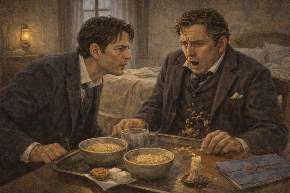 Он торопливо, сдёрнув салфетку, принялся счищать с себя кашу, отряхивая полы сюртука. Движения у него были сбивчивые, неровные, словно он действовал скорее инстинктивно, не до конца понимая, что делает и зачем.