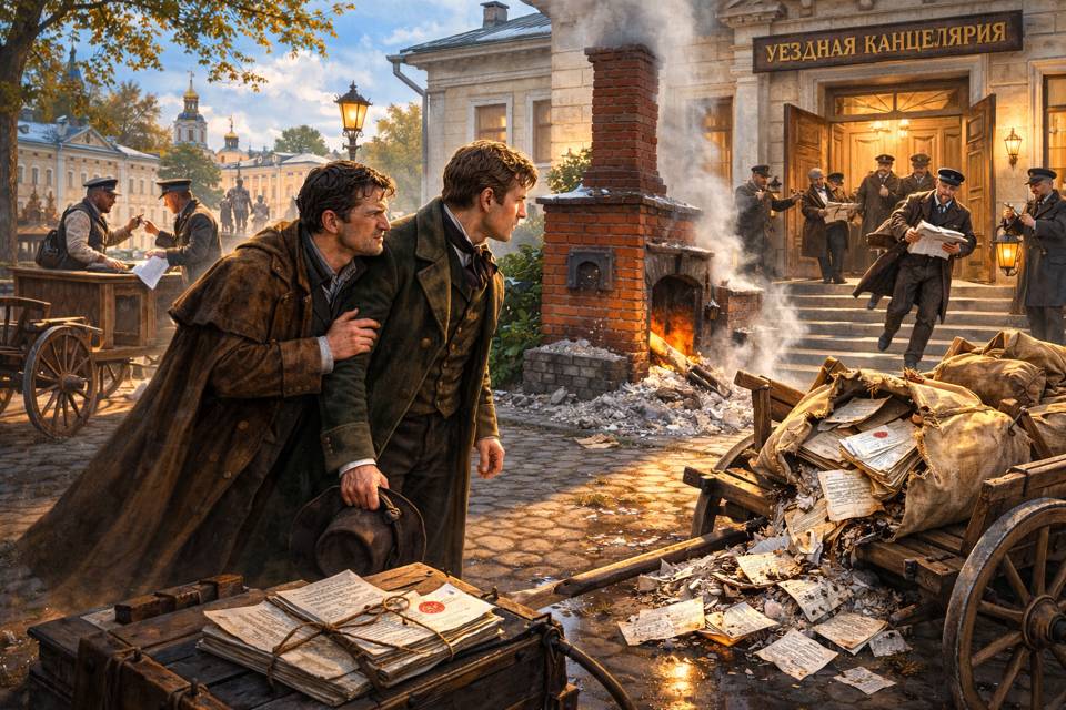 В обычный день подобная суета показалась бы нелепой для уездного порядка. Все-таки бумагам прилично не спешить и не бегать, а чинно путешествовать из стола в стол неделями, будучи сопровождаемыми поклонами, визитами и бесконечными переписками. Однако сейчас всё происходило иначе, слишком быстро и именно оттого слишком открыто. Спрятать концы просто не успевали.
