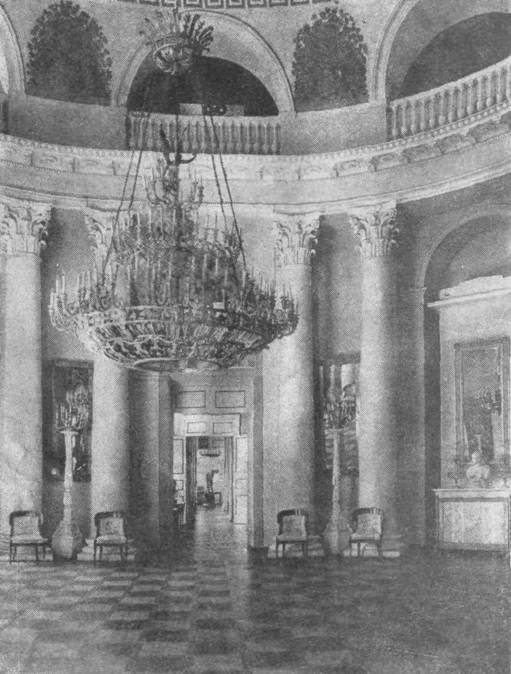 Парадные комнаты дворца открываются вестибюлем. Его холодная торжественность подчеркнута серебристо-серым колоритом стен.