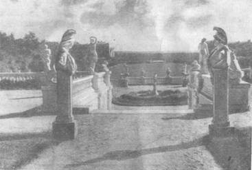 Перед террасами расстилается зеленое поле партера, обрамленное мраморными статуями (ритмично чередуются статуи и бюсты) и рядами лип, прежде шарообразно подстриженных.
