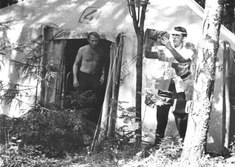 Принятие претендентов в Единение привело к изменениям ситуации с размещением в лагере. Комнатка в торце павильона позволяла поставить только четыре кровати, а количество участников стало пять. Поэтому решили поселиться в армейской палатке, которые ставились для студентов при большом количестве желающих отдыхать в лагере и ограниченности мест в павильонах. Поскольку руководство лагеря, да и все тренеры привыкли к не обременяющим никого спортивным фанатам, то палатку разрешили ставить в любом месте на территории лагеря. Естественно выбор пал на экзотическое место: до бадминтонной площадки – 10 метров; до столовой – 25 метров; до озера – 30 метров; до павильонов со студентами – 150 метров. В выбранном расположении имелся столб с лампой на нём; вокруг низкие ёлочки и кустики, за которыми следуют их высокие собратья, полностью скрывающие палатку от внешнего взора. И, если раньше, живя на веранде павильона, в котором находились студенты, участники Единения старались не шуметь и даже не включать радиоприёмник вечером, и, тем более, в ночное время, то теперь появилась некая автономность проживания в лагере, относительная свобода в режиме дня. Стало возможным принимать гостей после отбоя, слушать с ними музыку и даже пить горячий чай (умельцы установили на столбе розетку). Часто раздвигались кусты, и заглядывал начальник лагеря, осуществляющий вечерний обход: «Ну, как вы тут?» Жизнь приобрела новые черты.