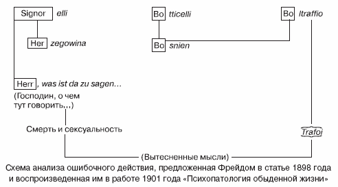 Схема анализа ошибочного действия, предложенная Фрейдом в статье 1898 года и воспроизведенная им в работе 1901 года «Психопатология обыденной жизни»