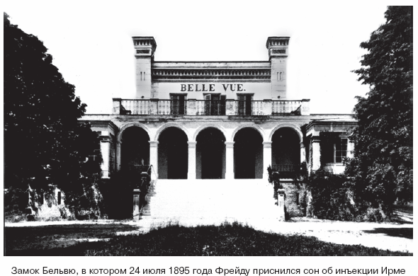В ночь с 23 на 24 июля 1895 года недалеко от Вены, в замке Бельвю, где Фрейд отдыхал со своей семьей, ему приснился следующий сон: «Большая зала– много гостей. Среди них Ирма: я беру ее под руку, точно хочу ответить на ее письмо, – упрекаю ее в том, что она не приняла моего „решения“. Говорю ей: „Если у тебя есть еще боли, то ты сама виновата“. Она отвечает: „Если бы ты знал, какие у меня боли в горле, в желудке и в животе, мне все прямо стягивает“. Я пугаюсь и смотрю на нее. У нее бледное, опухшее лицо. Мне приходит в голову, что я мог не заметить какого-нибудь органического заболевания. Я подвожу ее кокну смотрю ей в горло. Она слегка противится, как все женщины, у которых вставные зубы. Я думаю, что ведь ей это нужно. Рот открывается, я вижу справа большое белое пятно, а немного поодаль странный нарост, похожий на носовую раковину; я вижу его сероватую кору. Я подзываю тотчас же доктора М. Тот смотрит и подкрепляет мое мнение… У доктора М. совершенно другой вид, чем обыкновенно. Он очень бледен, хромает и почему-то без бороды… Мой друг Отто стоит подле меня, а друг Леопольд исследует ее легкие и говорит: „У нее притупление слева внизу“. Он указывает еще на инфильтрацию в левом плече (несмотря на одетое платье, я тоже ощущаю ее, как и он…). Доктор М. говорит: „Несомненно, это инфекция. Но ничего: у нее будет дизентерия, и инфекция выйдет…“ Мы почему-то сразу понимаем, откуда эта инфекция. Отто недавно, когда она себя почувствовала нездоровой, вспрыснул ей препарат пропила– пропиле… пропиленовую кислоту… триметиламин (формулу его я вижу ясно перед глазами)… Такой инъекции нельзя делать легкомысленно… По всей вероятности, и шприц был не совсем чист» (3. Фрейд. Толкование сновидений. – М., 1997. – С. 110–111).
