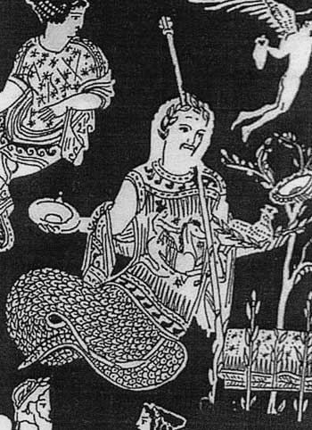 Доискиваясь до самых глубинных истоков бажовских мифологических образов нельзя также пройти мимо одной из главных богинь античного пантеона, покровительницы греческого народа Афины Паллады. На многочисленных изваяниях (в том числе на знаменитой статуе работы Фидия, стоявшей в главном святилище афинян – Парфеноне) она изображалась вместе с огромным змеем, принявшим S-образную стойку. Этот змей у ног Совоокой богини порождает множество вопросов. Традиционно считается, что сей змей – всего лишь символический атрибут у ног девы-воительницы. Однако беспристрастный и скрупулезный анализ приводит к совершенно неожиданному выводу: змей этот – сынАфины Паллады, коего она, оставаясь девственницей, сотворила с помощью магических действий.