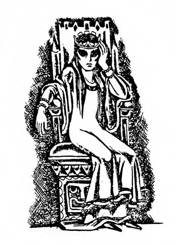 И правда, посветлело впереди. Выехали они из пещеры снова в горы. По уступам гор лес растет. И горы диковинные, и лес диковинный. Присмотрелась молодая – всё кругом оловянное. Скалы из олова, на дубах да осинах ветки и листья из олова, на елях и соснах кора оловянная, хвоя оловянная. Высунулась в окошко молодая, посмотрела вверх – и небо над ней оловянное, тусклым светом светится. Всё будто во сне застыло, не шелохнется, да и откуда под землей ветру взяться?! Расступились наконец оловянные горы. Широкая долина перед ними. Всё заблестело кругом. Трава там из зеленого камня, цветы самоцветные, из голубого камня небо над головой. А посреди долины стоит золотой дворец с серебряными окнами». {15}