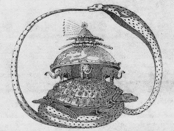 По сути своей Великий Полоз и другие змееподобные мифологические персонажи мало чем отличаются от подземных драконоподобных чудовищ, стойкие представления о коих закреплены в фольклоре большинства народов мира. Русский Змей Горыныч тоже в горе живет, потому-то и Горынычем прозывается. Вообще же Змей – древнее тотемное{45} пресмыкающееся и одновременно объект почитания во многих архаичных культурах мира. О тотемных функциях Змея свидетельствует хотя бы русская народная сказка «Кузьма Скоробогатый», где явственно проступают черты двух древних тотемов – Змеи и Лисицы. Кроме того, в русском народном мировоззрении до самого последнего времени сохранялись еще и реликты древних арийских и доарийских представлений о Космическом змееподобном существе (драконе), первотворце Вселенной. По русским поверьям апокрифического происхождения считалось, что Земля покоится на огнеродном Змее, живущем в Огненной реке или в Океан-море. В болгарских апокрифах рисуется еще более подробная картина: Змей покоится поверх Вола, тот стоит на Рыбе, плавающей в море, которое, в свою очередь, держит на себе огромная Черепаха (представления о последней восходят к самым истокам индоарийской древности и смыкаются с божественной личностью первопредка Кашьяпы, который в переводе с санскрита как раз и означает «черепаха»).