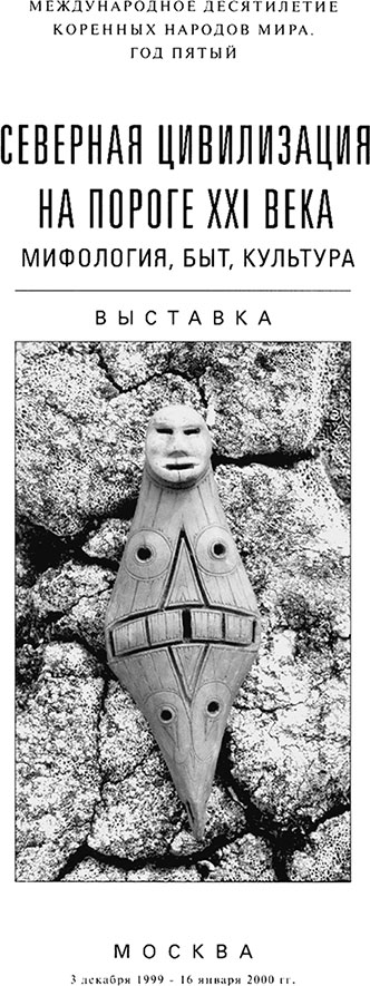 Следовательно, мировое древо – код для обозначения пространственно-временных процессов, суть которых невозможно выразить на языке Евклидовой геометрии; сам же трехмерный (объемный) или двухмерный (изобразительный) образ мирового древа – символ, опорный образ мысли, помогающий человеку проникнуть в суть и в глубь объективной реальности. В наибольшей степени это относится к явлениям жизни, которые и не обрисовать иначе, как в форме пространственно-плоскостного (или объемного) образа. Потому-то Мировое (Космическое) древо именуется еще и Древом Жизни.Шаманский наряд – не просто одеяние: как и бубен, он символ Вселенной, представленный в форме единства Макро– и Микрокосма. Это прекрасно можно было увидеть на выставке «Северная цивилизация на пороге XXI века: мифология, быт, культура» (рис. 43), организованной в Москве в преддверии XXI века. Здесь были собраны бесценные реликвии и национальные святыни малых народов Русского Севера, Сибири и Дальнего Востока, чьи исторические корни уходят в неведомые глубины седой старины. Свои лучшие экспонаты представили не только главные хранилища страны – Петербургский этнографический музей и Московский музей народов Востока, – но и музеи Мурманска, Красноярска, Петрозаводска, Салехарда, Тобольска, Тюмени, Хабаровска, Ханты-Мансийска, Якутска, куда – из-за естественной отдаленности – попасть бывает очень сложно. Шаманская экспозиция московской выставки, развернутой в залах Государственного музея современной истории России (бывший Музей революции), оказалась самой обширной и представительной. Полные облачения сибирских, алтайских, таймырских, обских, енисейских, прибайкальских, амурских, чукотских и прочих шаманов со всеми аксессуарами и причиндалами красовались на витринах, точно на невиданном конкурсе колдовства. И все без исключения – подлинные произведения народного искусства, отразившие художественные достижения национальных культур малых народностей, их представления о мире, эстетику, поэтику, атрибутику и архаичные корни.