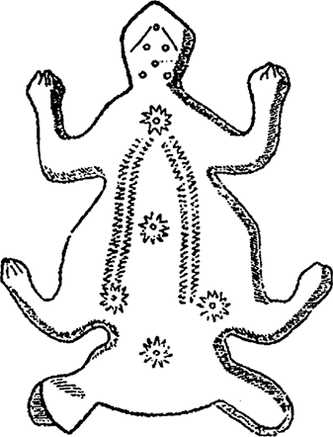 Особый интерес вызывает одна из самых популярных и поэтичных сказок о Царевне-лягушке (рис. 25). То, что здесь мы имеем дело с одним из архаичных тотемов, не вызывает никакого сомнения. Более того, речь идет о матриархальном тотеме. По народным поверьям, из-за сходства лягушачьих лап с человеческой ладонью считалось, что лягушка в прошлом была человеком и естественно – женщиной. Отсюда же – непременное использование лягушки (в основном – разных ее частей) в любовной магии – при изготовлении различных снадобий, привораживающих объект вожделения или, наоборот, отваживающего соперника (соперницу). В Ярославской губернии в давние времена существовал обычай: по совету знающих людей, старые девы, засидевшиеся в невестах, чтобы поскорее выйти замуж, должны были на болоте поймать лягушку и, присев, прикоснуться к ней обнаженными гениталиями.