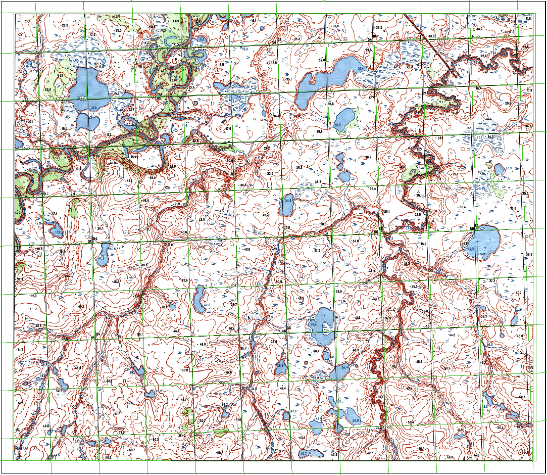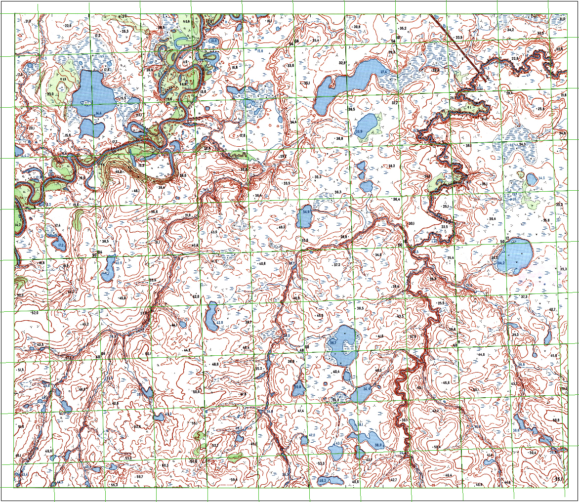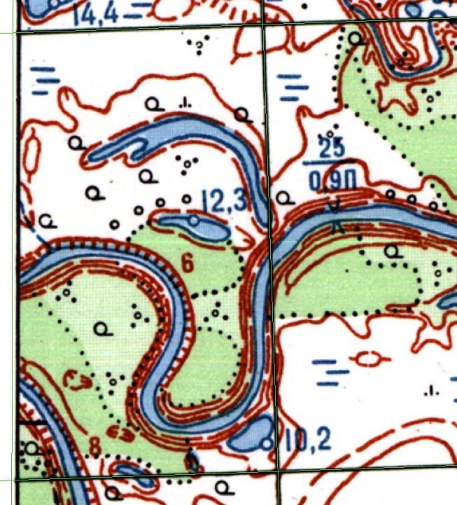 Зеленые линии на рис. 2 – это километровая сетка в системе координат листа карты. В данном случае мы имеем дело с обычными незначительными деформациями, но для векторизации исходное изображение не годится.
